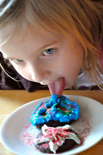 After we dropped the other sproutlets at their schools and preschool, Sprout and I attempted shopping again. This time the trip was tantrum-free, and we got some fresh food! And baking goodies! So Sprout had a lunch of scrambled eggs with cheese, and strawberries, and this afternoon we baked fudgy chocolate cookies, then covered them with frosting and sugar sprinkles.